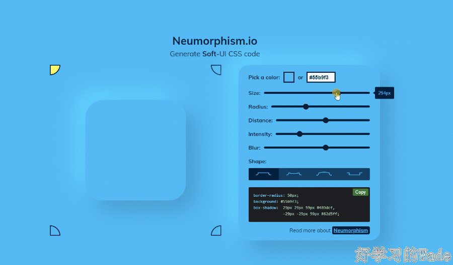 平常制作一个拟物风格的图标,我们可能需要借用 PS 或者 Ai,新流行的拟物风格也能这么做。但更简单的方式是用 Neumorphism 网站在线生成。你只需要在 pick a color 中选择一个主题色,然后手动调节尺寸、半径、距离、强度、模糊和形状等参数,即可快速获得一个全新拟物样态。你甚至可以直接复制它的 CSS 代码用于你的开发项目中。